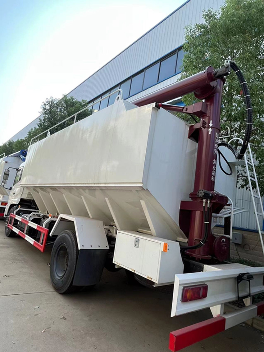 散裝飼料運(yùn)輸車,散裝飼料車的飼料罐架設(shè)在卡車的底盤上,罐頂開有進(jìn)料口.頂部的一根螺旋輸送卸料管(俗稱卸料絞龍)則可自由回轉(zhuǎn)和抬升,抬升的仰角可達(dá)60度。運(yùn)輸時(shí),頂部的螺旋管平臥在罐頂;卸料時(shí)則抬起,使管端的出料口與畜禽飼養(yǎng)場貯料罐頂部的進(jìn)料門相接,駕駛室內(nèi)裝有操縱裝置(操縱裝置也可裝置在罐體尾部),卸料時(shí)通過車底的動(dòng)力輸出軸和減速器來驅(qū)動(dòng)螺旋,以完成卸料。