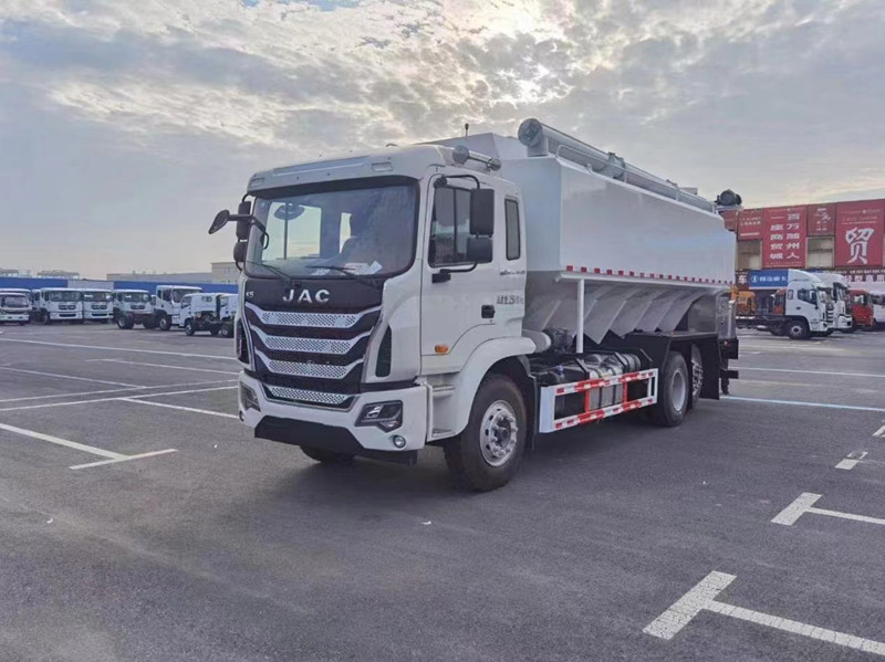 散裝飼料運輸車,散裝飼料車的飼料罐架設(shè)在卡車的底盤上,罐頂開有進料口.頂部的一根螺旋輸送卸料管(俗稱卸料絞龍)則可自由回轉(zhuǎn)和抬升,抬升的仰角可達60度。運輸時,頂部的螺旋管平臥在罐頂;卸料時則抬起,使管端的出料口與畜禽飼養(yǎng)場貯料罐頂部的進料門相接,駕駛室內(nèi)裝有操縱裝置(操縱裝置也可裝置在罐體尾部),卸料時通過車底的動力輸出軸和減速器來驅(qū)動螺旋,以完成卸料。