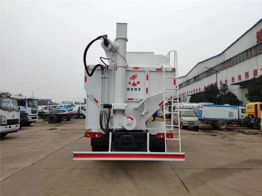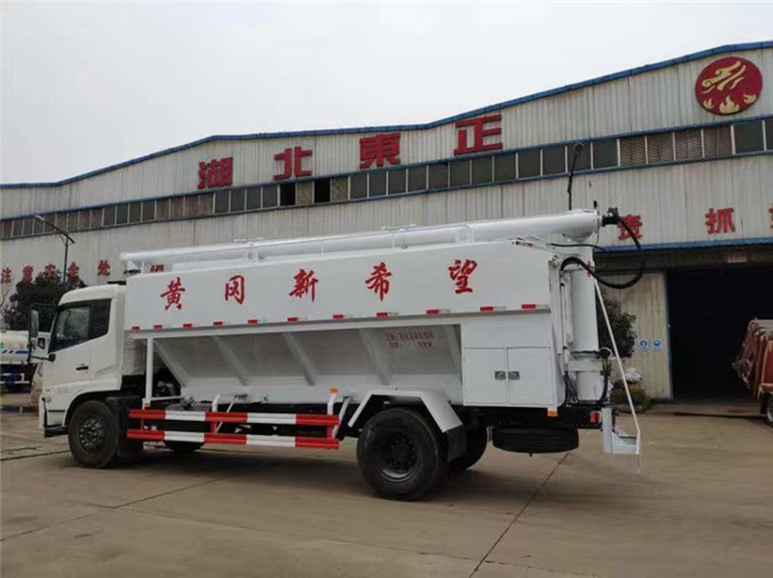 散裝飼料運(yùn)輸車,散裝飼料車的飼料罐架設(shè)在卡車的底盤上,罐頂開有進(jìn)料口.頂部的一根螺旋輸送卸料管(俗稱卸料絞龍)則可自由回轉(zhuǎn)和抬升,抬升的仰角可達(dá)60度。運(yùn)輸時(shí),頂部的螺旋管平臥在罐頂;卸料時(shí)則抬起,使管端的出料口與畜禽飼養(yǎng)場貯料罐頂部的進(jìn)料門相接,駕駛室內(nèi)裝有操縱裝置(操縱裝置也可裝置在罐體尾部),卸料時(shí)通過車底的動(dòng)力輸出軸和減速器來驅(qū)動(dòng)螺旋,以完成卸料。
